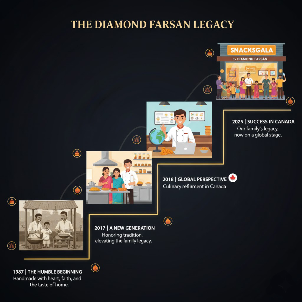 Born in Gujarat. Crafted in Canada. In 1987, the first batch of Diamond Farsan was made by our parents in Ankleshwar, India. It was a business built on “heart, faith, and determination.” Today, we carry that same torch across the ocean.
